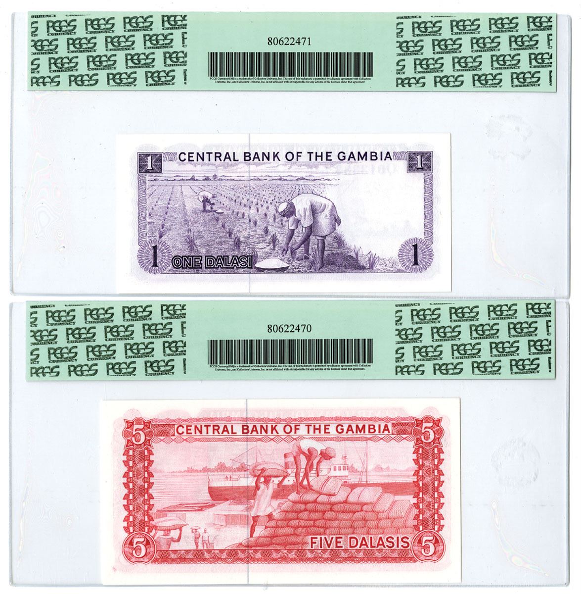 Gambia, ND (1971-87)-ND (1972-86). Lot of 2 Issued Banknotes, Includes: 1 Dalasi, P-4f, Purple on m/c underprint, Portrait of President at right, S/N Q013383, PCGS graded Superb Gem New 67PPQ; 5 Dalasi, P-5c, Red on m/c underprint, Portrait of President at right, S/N N877133, PCGS graded Gem New 66PPQ. (2). Sold "AS IS" no returns accepted.