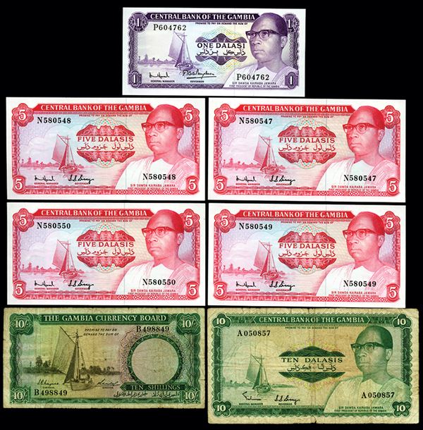 Gambia, Lot of 7 notes; Includes 10/-, P-1a, Fine; 1 Dalasi, P-4, CU; 5 Dalasis (4), P-5, CU to Gem Unc.; 10 Dalasis, P-6. Attractive group of notes.