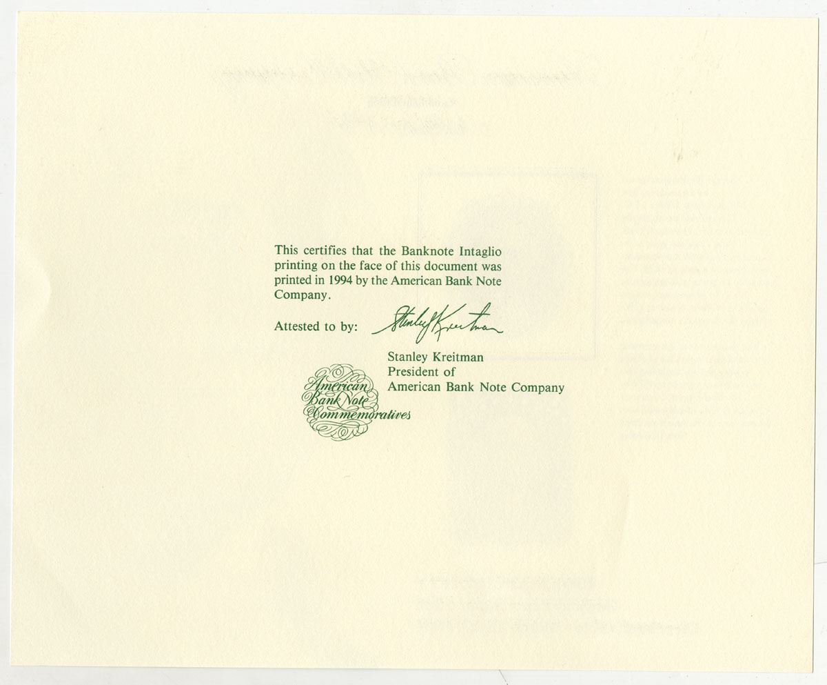 104th March Party Garfield-Perry Stamp Club March 1994. Portrait of George Washington commissioned for the Continental Bank Note Co. in1879 by an unknown engraver who took inspiration from the Athenaeum portrait painted by Gilbert Stuart in 1796. The Stuart portrait appeared on a number of US stamps including the 10 cent stamp printed in 1855 by Toppan, Carpenter, Casilear & Co. Uncirculated, ABNC. 50 Pieces.
