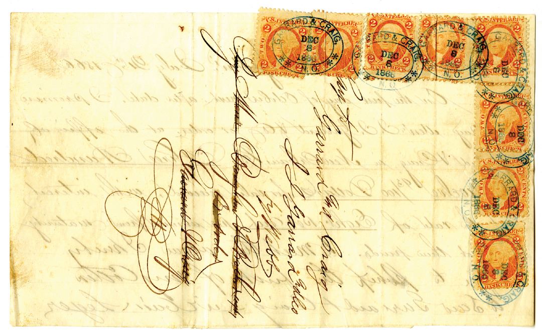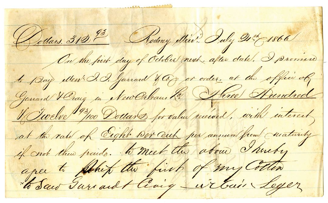 Louisiana and Mississippi, 1866. $312.93 Issued 8% Promissory Note, Handwritten on lined paper, appears to mention the exchange of cotton at bottom. 8 Adhesive revenue stamps in orange are on back, with Garrard & Craig handstamps. Fine condition with faint staining at top right, and some toning from adhesive stamps. Garrard & Craig (also known as Garrard, Craig & Co.) was a cotton firm in New Orleans. Evidently, Wilbur Leger, the signer of the note had gotten and advance from Garrad, Craig & Company for his cotton shipment.