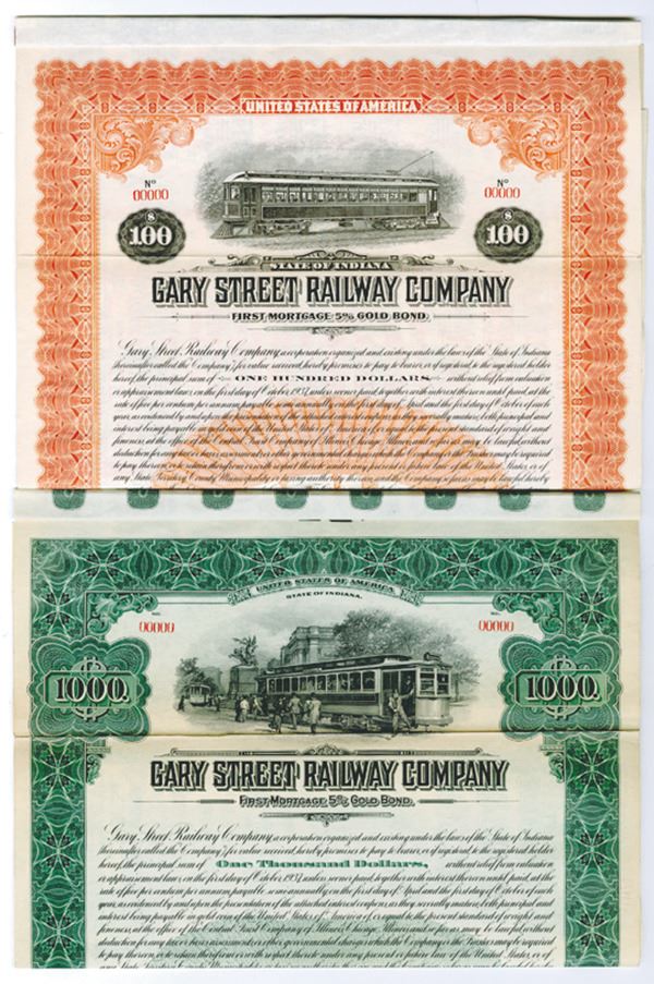 Indiana. 1917 Lot of 2 Specimen Bonds, includes $100 First Mortgage 5% Bond, orange, streetcar; and $1000 1st Mortgage 55 Gold Coupon Bond, Green, Both VF to XF with folds archivally reinforced, POC's, folded in thirds, as made. ABNC. (2)