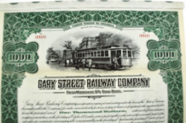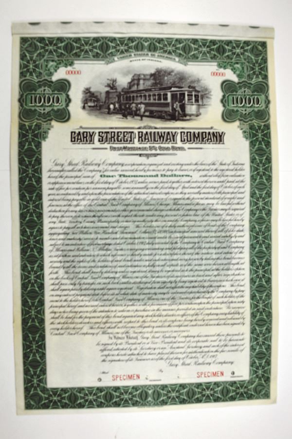 Indiana. 1917. $1000 First Mortgage 5 % Gold Bond, Green frame, streetcar in town vignette, ABNC.