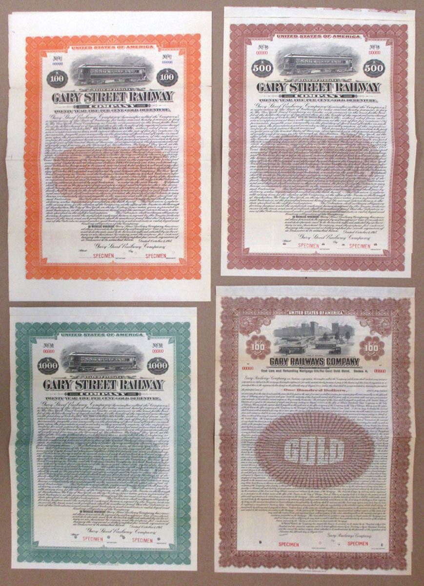 Indiana, 1917 to 25. Lot of 4 Specimen Coupon Bonds: 1917, Gary Street Railways, $100 Orange, $500 Brown, and, $1000 Green, 5% Gold Coupon Bond trio; 1925, Gary Railways Co., $100 brown, 6 1/2% Gold Coupon Bond. All have Specimen overprints and POCs, are in Fine to VF condition, ABNC. (4). Sold "AS IS" no returns accepted.