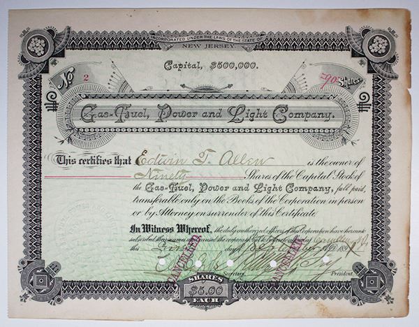 New JerseyÉ. 1891. 90 Shares I/C Capital Stock Certificate #2, Black text with black border and green background. Fine condition with staining and some signs of wear along bottom, top, and right margins.