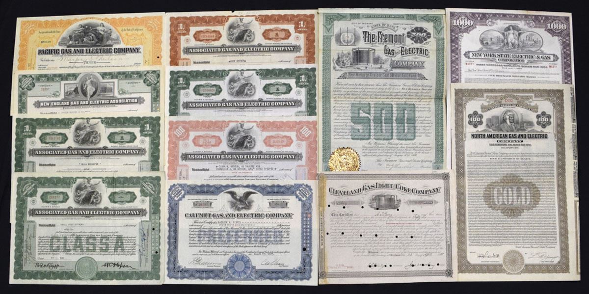 Various States, ca. 1900-40s. Lot of 12 issued stock and bond certificates from gas and electric companies. Highlights include: Pacific Gas and Electric Co.; Associated Gas and Electric Co.; New England Gas and Electric Association; Fremont Gas and Electric Co.; New York State Electric & Gas Corp.; North American Gas and Electric Co.; Calumet Gas and Electric Co.; and Cleveland Gas Light Coke Co. Condition ranges VF to XF, with some punch and ink cancellations, folds, and light handling. (12). Sold “AS IS” no returns accepted.