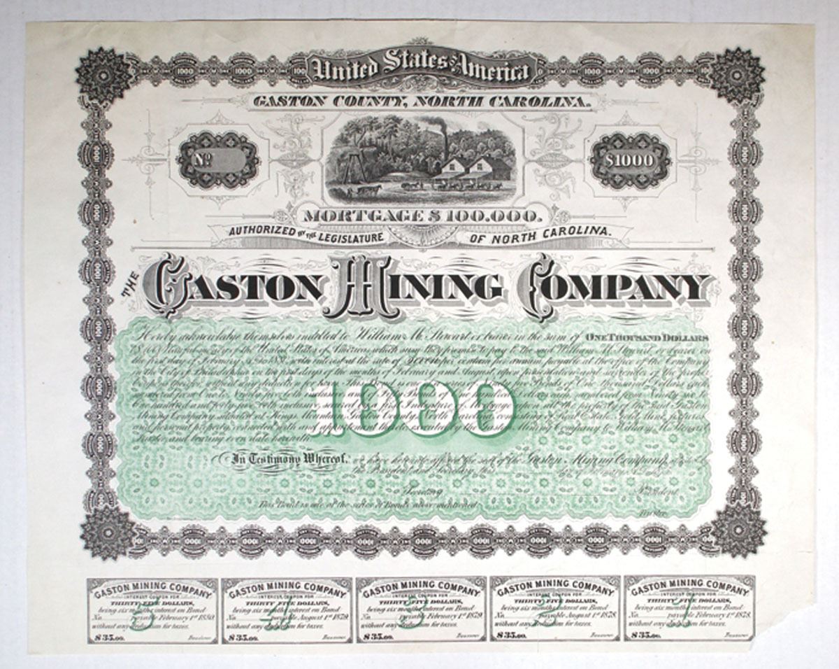 Gaston County, North Carolina, 1875. $1000 Specimen/Proof 7% Coupon Bond, Black printing with ornate black border and green underprint, Mine building with mine shaft at top, 5 Coupons attached at bottom, VF to XF condition with bottom right corner missing, Theo. Leonhardt & Son.