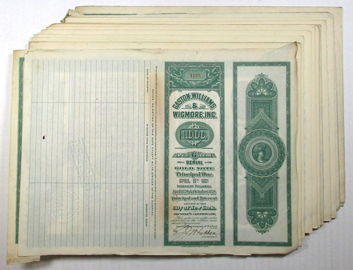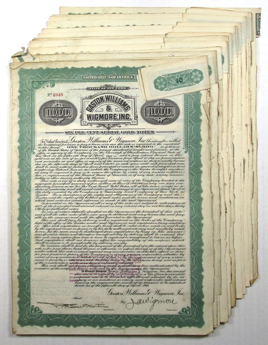New York, 1916. Lot of 40+ $1000, I/U 6% Serial Gold Coupon Bonds, Black print on green border and underprint with company title at top. Bonds range from Fine to VF condition. ABNC. (45). Sold "AS IS" no returns accepted. Gaston, Williams & Wigmore, Inc. was incorporated in New York in 1914. The company was and exporter and importer of goods, including automobiles, structural steel, machinery, chemicals, dry goods, tobacco, hardware, electrical supplies, provisions, hides, skins, coffee, cocoa, ores, rubber, sugar, fustic, dyewoods, and logwood. They operated a fleet of vessels and were part owners of the International S.S. Company. The company's name was changed to Gaston and Company in 1921.