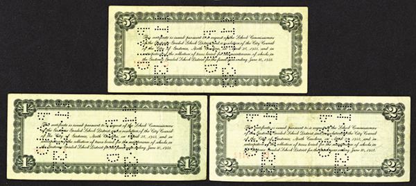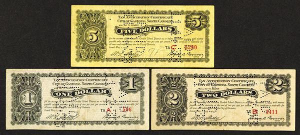 North Carolina. 1, 2, 5 Dollars. Perforated PAID. Fine to Very Fine. 3 pieces.