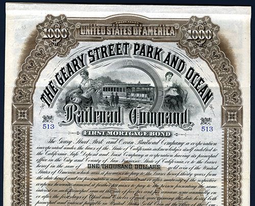 California, 1891, $1000, 1st Mortgage 5% I/U Bond, #513, Vertical format, Coupons attached, Allegorical figures flanking empty electric trolley, VF condition, FBNC. Red stamp notices of reduction in principle on bottom.