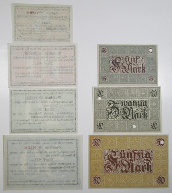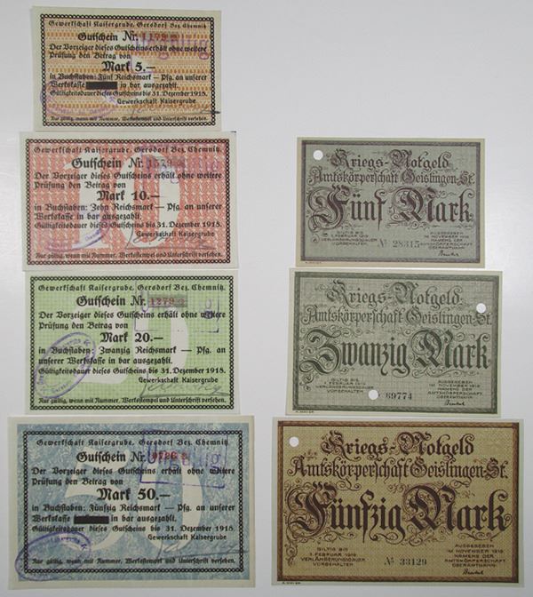 Germany. 1917, German Watr Notes, Lot includes a uniface quartet of 5, 10, 20, and 50 Mark Notgeld from Geislingen/Stiege Amtskšrperschaft, with oval validation stamps and signatures, and later voided with "UngŸltig" handstamp; also a trio of 5, 20, and 50 Mark from Gersdorf Bez. Chemnitz Gewerkschaft Kaisergrube, all with POC. About to Choice Unc. (7)