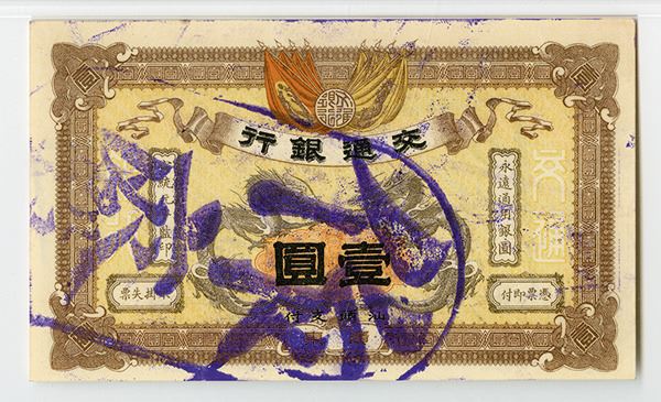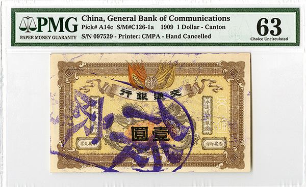 China. Canton issued 1 Dollar, 1909, P-A14c, S/M#C126-1a, PMG graded Choice Uncirculated 63 with comment "spindle hole". Hand cancelled and rare.