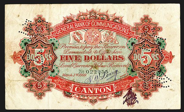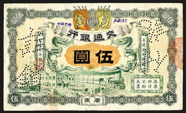 Canton, China, $5, P-A15b, S/M#C126-, Remainder banknote, Green and m/c with facing dragons, train and buildings on bottom, back red and blue, Perforated Chinese characters in middle, S/N 022955, Bright colors, firm paper and sharp colors only enhance this lovely note that is usually found in lesser grade and is seldom seen this nice.