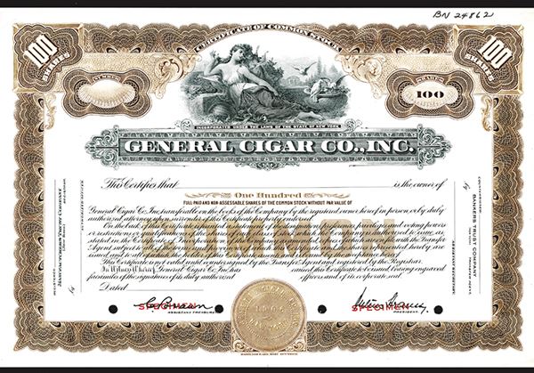 New York, 19xx, 100 Shares, Specimen Stock, Black on brown border and underprint, Vignette top center of reclined allegorical woman with cherub in garden with doves feeding off fruits in bowl, VF-XF condition, Hamilton BNC.