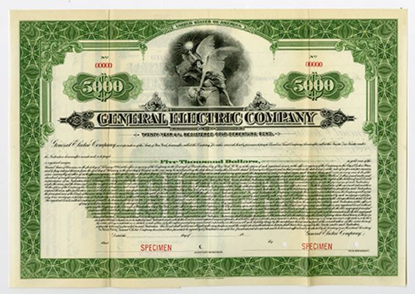 New York, ND (ca. 1920), Specimen $5000, 6% Registered Gold Debenture Bond. Black text with green border and undertint, allegorical angel holding winged Wheel of Progress and light. Specimen overprints and POC's and "00000" serial numbers, VF-XF condition with very slight toning along creases, ABNC.