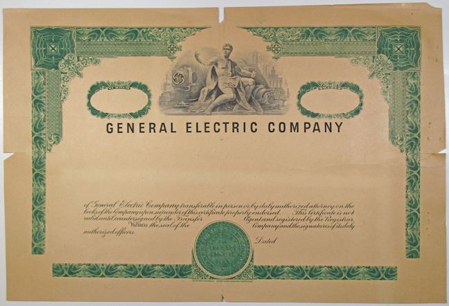 New York, 1950-60s. Odd Shares Progress Proof Stock Certificate on brown paper, Black text, green border, Allegorical man with generator depicted at top center. Fine-VF condition, SC-USBN. General Electric Company is an American multinational conglomerate.