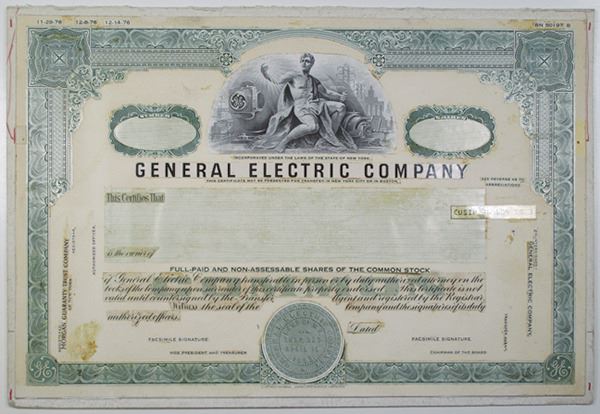 New York, 1976. General Electric, Odd Shares Proof Mockup Stock Certificate, Black text with green border and underprint, Allegorical man with generator featuring General Electric's logo at top center. Mounted on a hard backdrop, Fine condition. Unique proof made during stock design process, SC-USBN. General Electric Company is an American multinational conglomerate incorporated in New York City and headquartered in Boston. As of 2018, the company operates through the following segments: aviation, healthcare, power, renewable energy, digital industry, additive manufacturing and venture capital and finance.