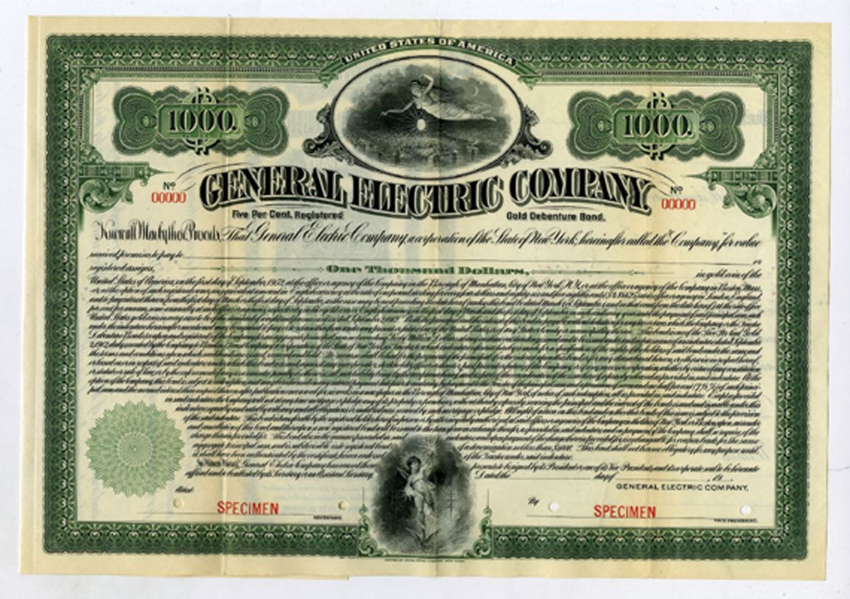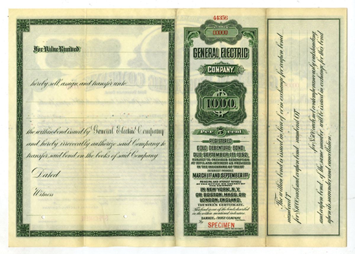 New York, ND (ca. 1902). $1000 Registered 5% Specimen Gold Debenture Bond, Black print on green border and under print, Allegorical woman flying above New York City at top and cherubs wire wires at bottom, Specimen overprints and POC's, XF to AU condition, ABNC. Rare Bond from this historic company.