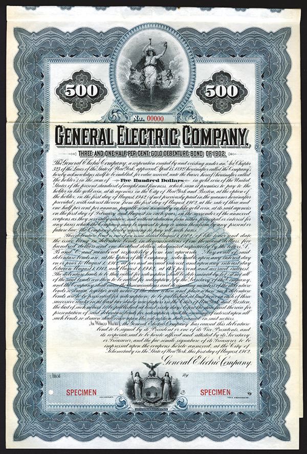 New York, NY, 1902, $500, 3 1/2% Gold Debenture Bond of 1902, Coupons attached, Allegorical woman holding telephone and battery with cherub in background, Black on slate blue border and underprint, Specimen overprints, POC's, Fine to VF condition, ABNC. Rare and early G.E. Bond.