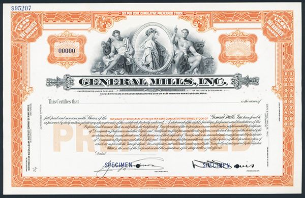 Delaware, 19xx (ca. 1920-30), <100 Shares, Specimen Stock, Black on orange border and underprint, Reapers flanked by two sitting allegorical men, Blue SPECIMEN overprints POC's, XF condition, ABNC.