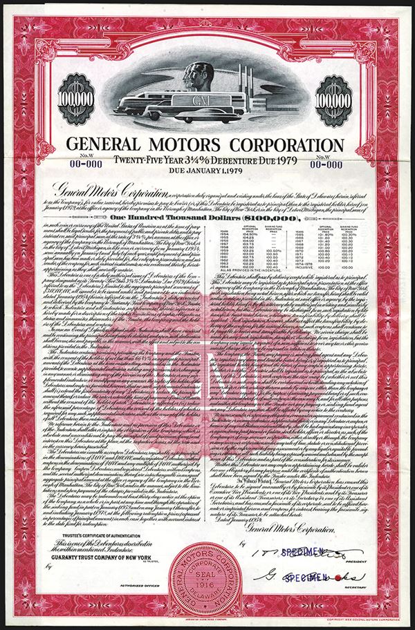 MI. 1954. Specimen $100,000. 25 Year 3 1/4% Debenture Due 1979. Dark rose border and undertint. Futuristic autos and trucks with the profiles of 3 big heads. Red Specimen overprints, "0000" serial numbers and POC's. Coupons attached. XF condition. ABNC. Rare bond with only 3 found in archive.