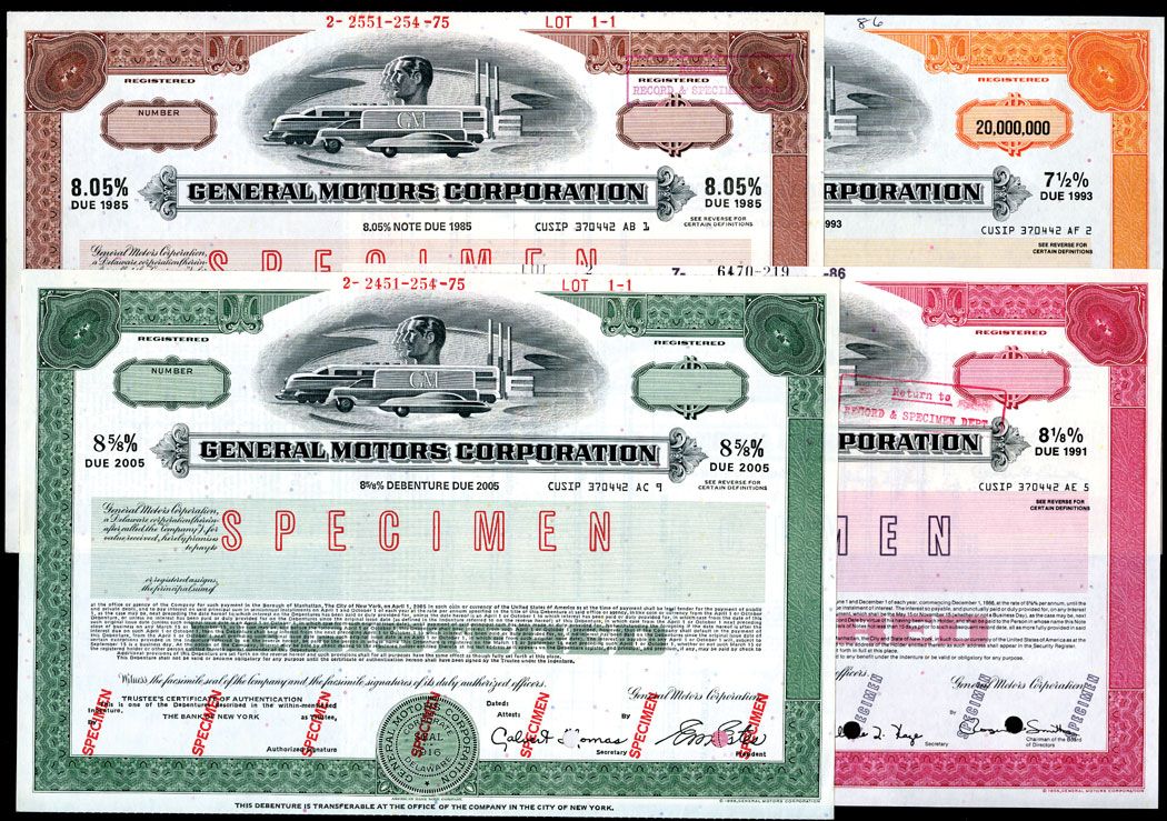 Specimen registered bonds of various colors and denominations. Includes $20,000,000 Registered 7 1/2% Note due 1993. All with profiles of 3 men and modern car, truck and train. Rare high denomination GM bond.