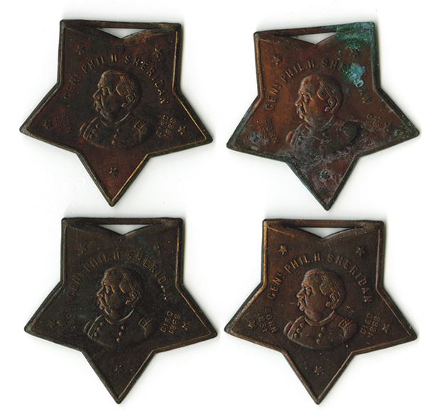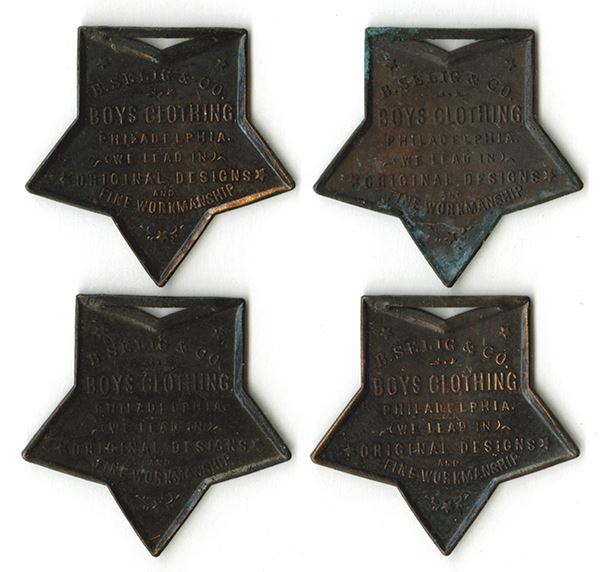 Pennsylvania. B. Selig & Co. Philadelphia, Boys Clothing. 5-pointed star planchette with portrait on obverse and store advertisement on reverse. 40mm, high borders on reverse. Copper with uneven tone. 4 pieces.