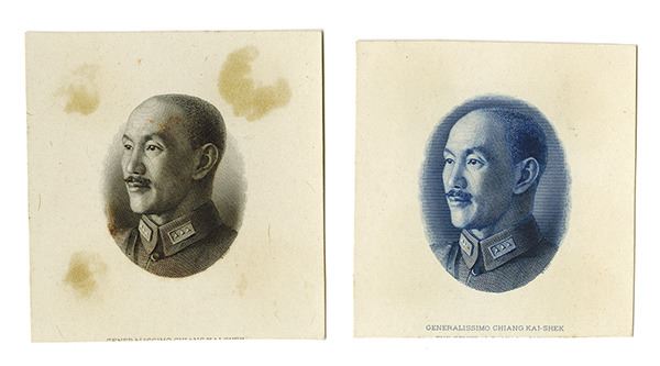 China, Lot of 2 proof vignettes, one printed in black, the second in blue, both on thin white paper or thin card, similar to vignette used on 1948 and 1949 banknote issues by ABNC. XF condition with glue stains on the black vignette. Both by ABNC. Rare proof vignettes