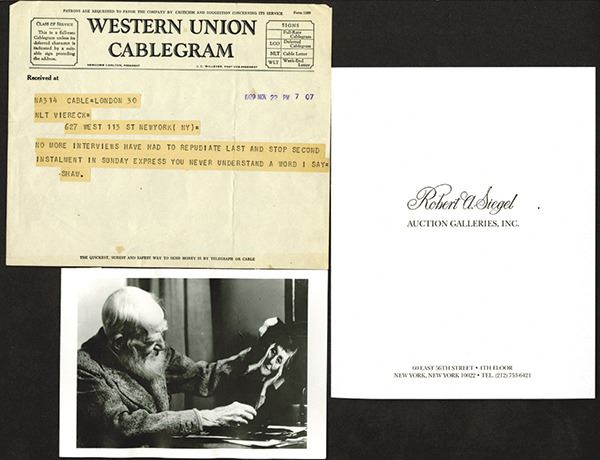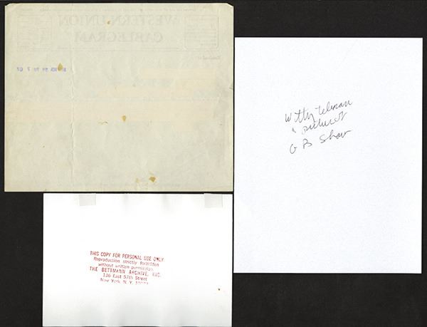 Great Britain. Two line cablegram from Shaw in London to NY. Along with a bent image of Shaw from the Bettmann Archive. 2 pieces.