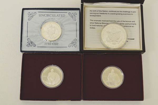 George Washington 250th 1982D, Uncirculated; 1982S (2) Proof. U.S. Bicentennial ARBC Medal. Silver Proof. All in official cases with certificates. 4 pieces.