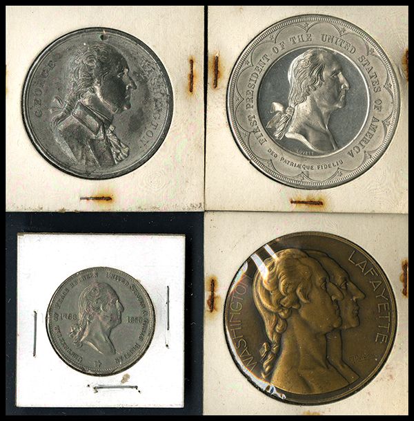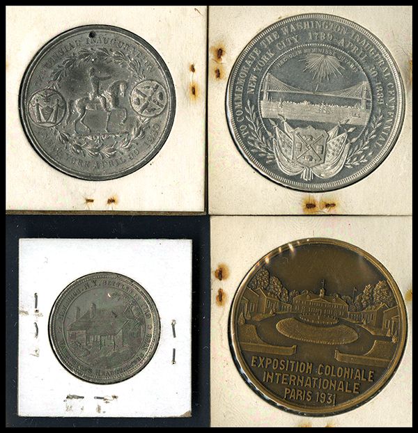George Washington Medal Assortment. Lot of 4 medals ca.1881 to1931, 3 are silver colored and one is bronze. Includes 1883 Washington's Headquarters in Newburgh, NY; and 1931 Paris Expo medal with Washington and Lafayette. Attractive assortment, weight approximately 1 lb.
