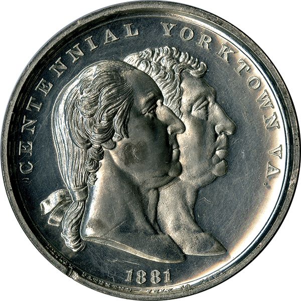 George Washington “Surrender At Yorktown” Medal. 1881. White metal, 50.5 mm, Uncirculated with prooflike surfaces, small rim nick on the obverse. Struck to commemorate the 100th anniversary of the Battle at Yorktown. Washington and Lafayette right, 1881 below. The reverse depicts the surrender. Engraved by P.L. Krider of Philadelphia. This medal was probably the inspiration for the obverse of the Lafayette Dollar.