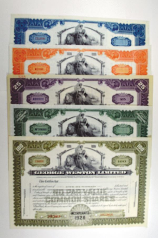 Canada. 25 Shrs, <100 Shrs, 100 Shrs, and -Odd Shrs (orange and blue). Specimens. CBNC. 5 pieces