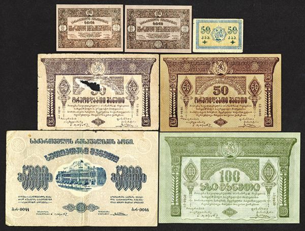 Lot of notes from Georgia as an autonomous republic as. Includes from the 1919 Issue 50 Kopeks, P-6; 1 Ruble, P-7 (2 pcs, UNC); 50 Rubles, P-11, UNC; 100 Rubles, P-12, UNC; and 5000 Rubles, 1921, P-15.