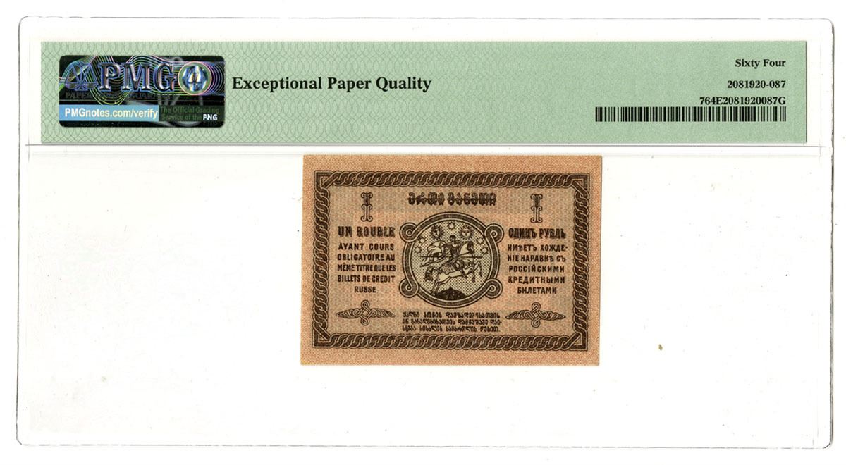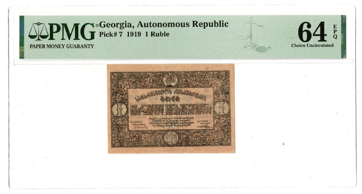 Georgia, 1919. 1 Ruble, P-7, Issued Banknote, Brown on pink underprint, Back is brown on pink with St. George on horseback at center, PMG graded Choice Uncirculated 64 EPQ.