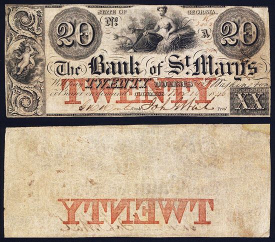 Columbus, Georgia, 1846, $20, Issued banknote, sitting reaper with scythe, sheaves and cattle on top middle, cherub on left, red TWENTY protector, S/N 3463, pp A, Fine to Choice Fine condition, RWH.