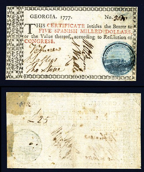 Georgia, 1777, $5 Spanish Milled Dollars, P-S799, Issued, S/N 3680, Cannon in seal on lower right, The Blue-green seals are the most difficult series of all the Georgia Colored Seal notes which were issued 1776 through 1778. It's an immensely popular series partly due to the unusual run of dollar denominations: $2, 3, 4, 5, 7, 9, 11, 13, 15, 17 Dollars. The note appears Choice XF to AU with nice margins, bright seal and fresh appearance with small edge faults on the left margin as well as light stain on the left margin back. This note brought $1,840 in a major sale in January, 2005, nearly eight years ago. Catalogs in Newman $2500 VF.