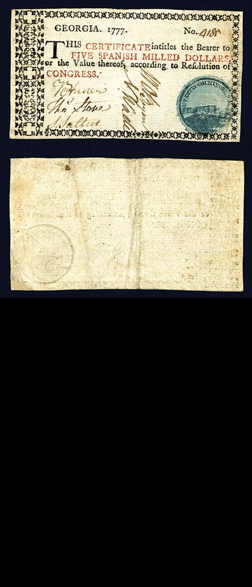 Georgia, 1777, $5 Spanish Milled Dollars, P-S799, Issued, S/N 4185, Cannon in seal on lower right, Another beautifully impressed seal and a well centered Choice VF note, with a hard to detect repair at the tip of the lower right corner. Catalogs in Newman $2500 VF.