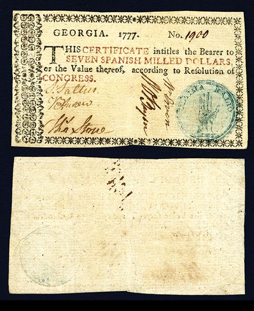 Georgia, 1777, $7 Spanish Milled Dollars, P-S800, Issued, S/N 1900, Hand in seal on lower right, One of the rarest notes of this desirable series. This is the only use in all of Georgia Colonial Currency of this seal with the upraised hand and the Latin motto, translated: The Ultimate Reckoning. A clean and almost perfect XF note with a small nearly undetectable corner repair. Always in demand, Catalogs in Newman $3750 VF-7500 XF.