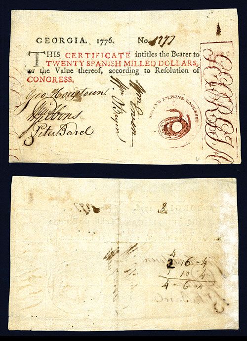 Georgia, 1776, $20 Spanish Milled Dollars, P-S777, Issued, S/N 1777, The maroon notes are the scarcest color in the 1776 Colored Seal Series. Unusually large size and bold printing for this very rare maroon seal note add to its desirability in spite of some restoration. (ex-Ford 10, 2006, Lot #4515, Sold for $2000).