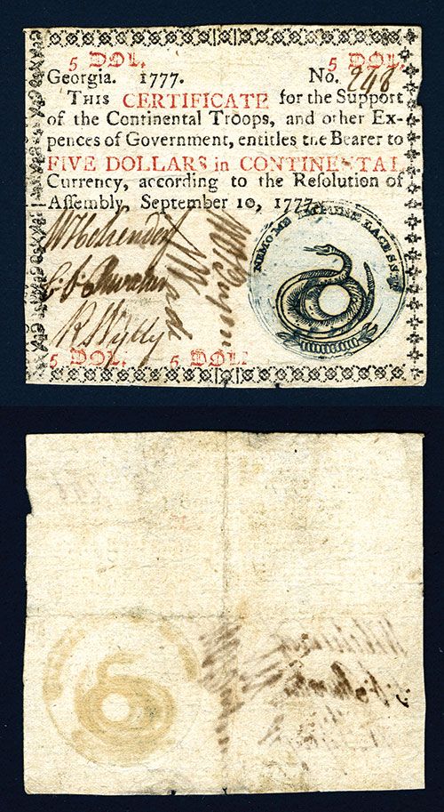 Georgia, September 10, 1777, $5, P-S838, Issued, S/N 248, The $5.00 denomination of this eight piece series, and the scarcest of those denominations other than the $8.00. This note is a pleasing VF note chosen for its superb vignette of a vivid blue coiled rattlesnake. Catalogs in Newman $3000.
