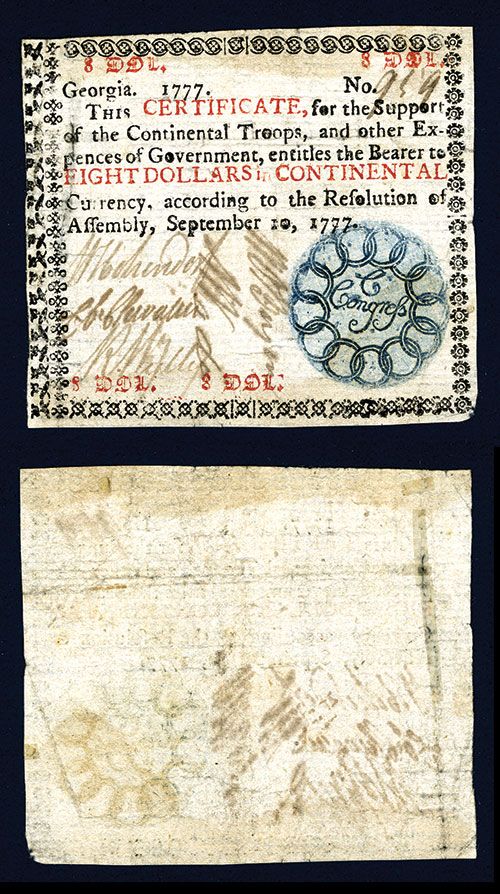 Georgia, September 10, 1777, $8, P-S841, Issued, S/N 919, The $8.00 is far and away the rarest note of this eight piece series. Ever popular because of the design of the seal being 13 rings surrounding C Congress meaning Continental Congress. This same design, in a modified version, was also used 12 years later on the reverse of the first official U. S. Coin - the 1787 Fugio Cent. A pleasing VF with a couple of thin splits repaired on the reverse. The most difficult note to obtain in the series and always in demand because of its vignette and its association with Ben Franklin. Catalogs in Newman, VF $2700, XF 6,000.