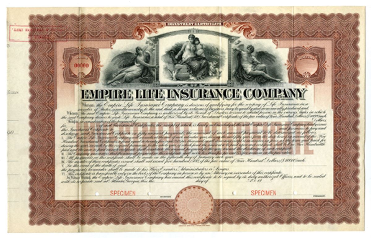 Atlanta, Georgia, ND (1900-10s). Specimen Investment Certificate, Black with brown border and underprint, Winged figures at top flank mother and children feeding birds, Specimen overprints and POCs, VF condition, ABNC.