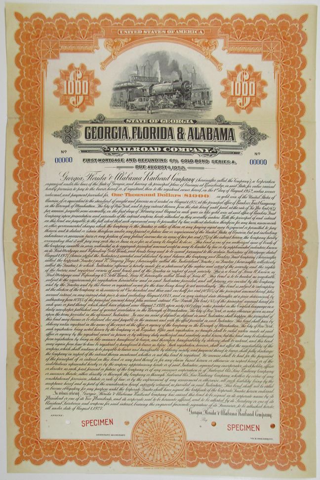 Georgia and Florida, 1927. $1000 Specimen 6% First Mortgage and Refunding Gold Bond, Black text with orange border and undertint, Train at busy station near car at top center. Red specimen overprints, 00000 serial numbers, and POCs. VF condition, ABNC. Listed railroad that is only known as a specimen in Cox, no issued examples seen. This was one of 3 examples found in the ABN Archives in 2002 and this is the only one available.