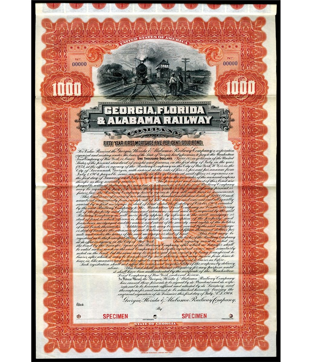 GA. FL. AL. $1000 Specimen 1st Mortgage 5% Gold Coupon Bond. Orange border. Train straight on approaching workers. XF condition. Coupons attached. POC's. Rare and attractive bond. Listed railroad, unlisted bond variety and date in Cox.