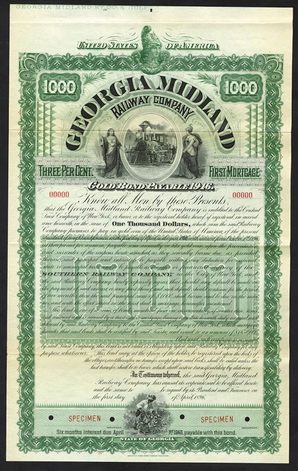 Georgia. $1000 Specimen 3% 1st Mortgage Gold Coupon Bond, Black print on ornate green border and under tint, Allegorical women flank framed image of locomotive under ornate company title, Specimen overprints and POC's, VF-XF condition without coupons included, ABNC. Only 2 found in the archives, rare, attractive and the only example that is available.