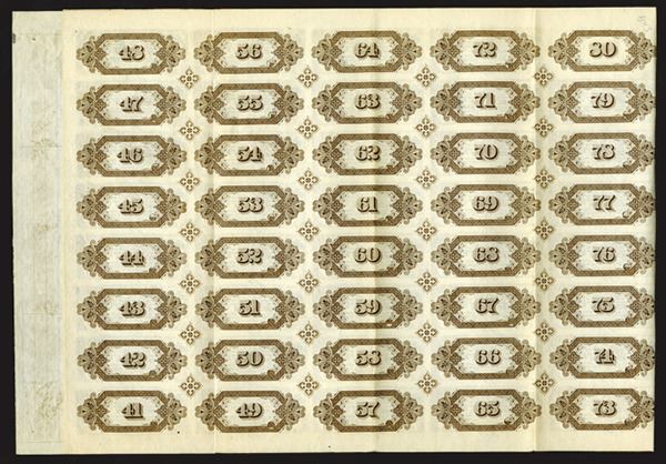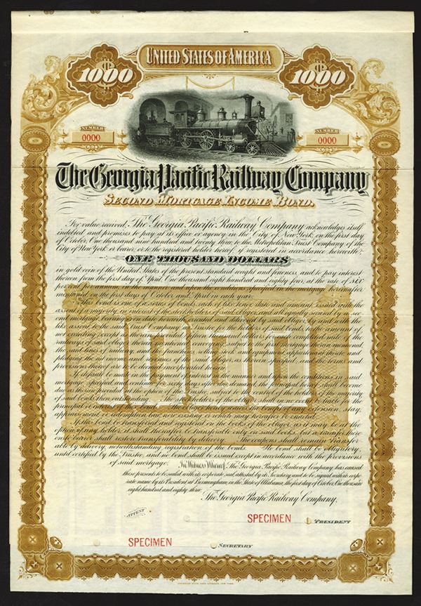 Georgia. $1000 Specimen 6% 2nd Mortgage Income Coupon Bond, Black print on brown border and under tint, Locomotive leaving station at top, Specimen overprints and POC's, VF-XF condition with toning along margins, ABNC. Only 2 found in the archives, rare, attractive and the only example that is available.