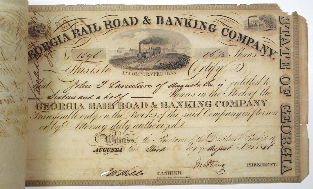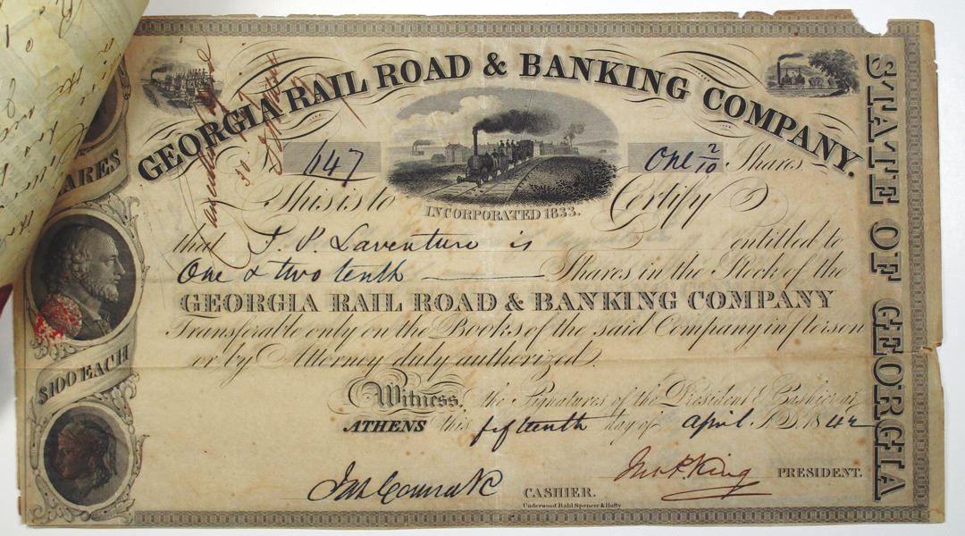 Athens, Georgia. Lot of 3, I/U stock certificates, All are attached on the left border where they were possibly part of a legal matter, Includes 1837, Issued in Athens, GA. 12 Shares, Small steam train on top left, Litho printing; 1842, issued in Athens, GA., 1 2/10ths Shares, Toned, chips off of top right margin, attractive, UBSH; and 1848, issued in Augusta, GA. 16 1/2 Shares, Similar design, different engraved issue location, UBSH, all made out to the same person. Attached by wax on left in 3 small areas that could be separated if desired. The 1837 stock certificate is R-7 rarity and the first that we have offered in auction. Evidently from a legal correspondence or lawsuit. (3 - attached together on left side)