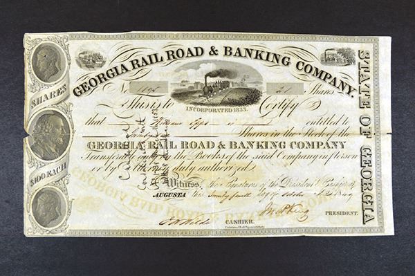GA. 21 Shrs Stock Certificate. Issued. Cancelled. Folded in quarters long ago, slight ink burn offset. Underwood, Bald, Spencer & Huff imprint. Nice. Slightest paper loss at right fold. VF+