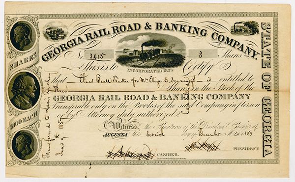 Augusta, Georgia. 1853, 3 Shares I/U Stock Certificate, Black print on black border, Locomotive moving down tracks along sea shore at top with allegorical cameo busts along left side, VF condition, Underwood Bald Spencer & Hufty.