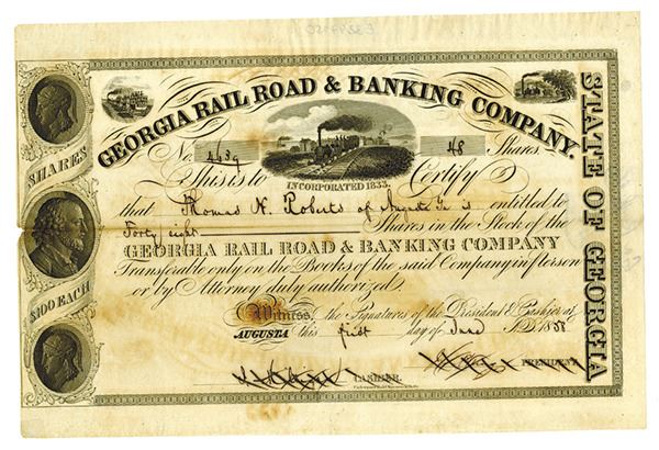 Georgia. 48 Shares Common Stock Issued Certificate, Black print on black border, Locomotive moving down tracks along sea shore at top with allegorical busts along left side, Fine condition with toning over certificate, Underwood Bald Speneer & Hufty.